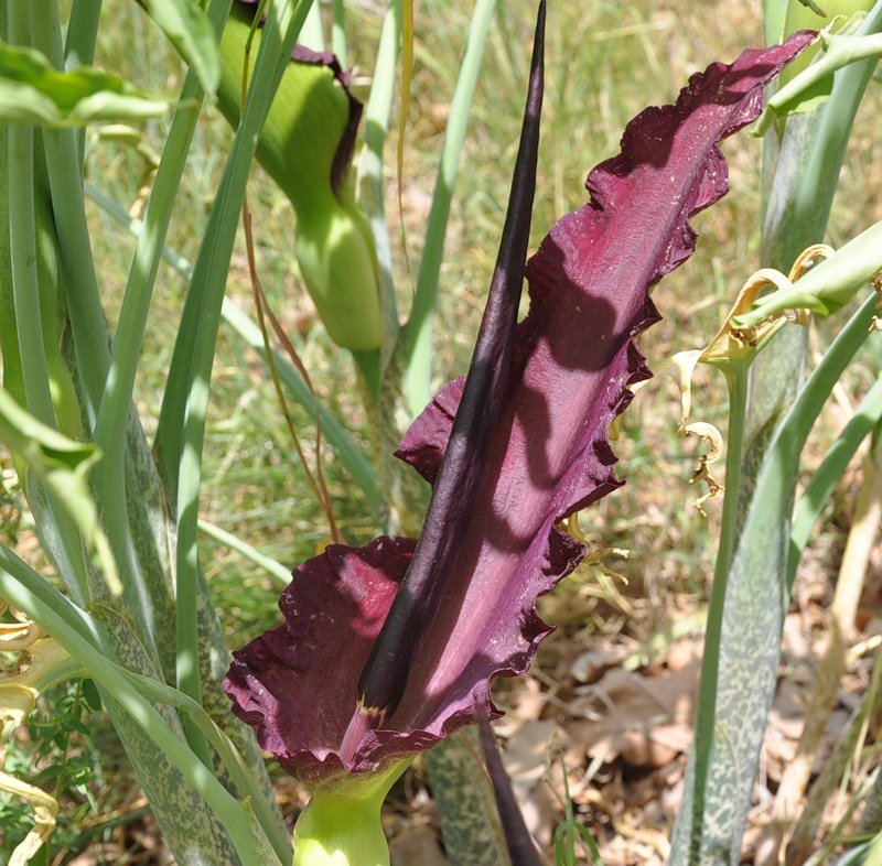• Стебли мясистые с пятнами коричневого цвета. Из-за этих коричневых пятен создается эффект змеиной кожи. Соцветие на стебле появляется в начале лета и представляет собой початок с покрывалом. Покрывало - волнистое по краям и его длина 45 см. Оно бледно-зеленое снаружи, а внутри – пурпурно-багровое. Початок тоже 45 см, а цвет темно-красный.