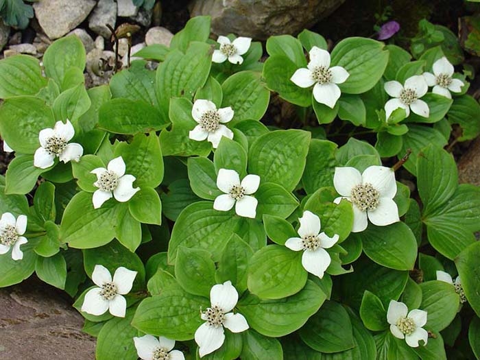 Саженцы канадского дерена образуют эффектные ковры, плотно покрывая почву зеленой листвой. Во время интенсивного цветения карликовые кустарники выпускают множество белых цветов, которые затем становятся красными неядовитыми ягодами. Используется в качестве почвопокровного растения. Особенности крупномера канадского дерена: