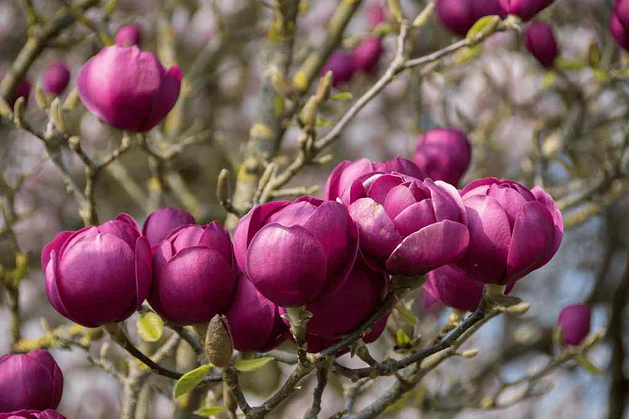 Саженцы магнолии гибридной Блэк Тюлип (Black Tulip): весной создается впечатление, что декоративные деревья покрываются настоящими большими тюльпанами. Цветение начинается в середине весны, крупными темно-лиловыми цветами. Листья зеленые, продолговатые, распускаются немного позже. Форма кроны очень раскидистая, ветвление начинается низко от земли. Взрослые крупномеры вырастают до 4 м в высоту. Магнолия гибридная Блэк Тюлип плодоносит яркими красными плодами.